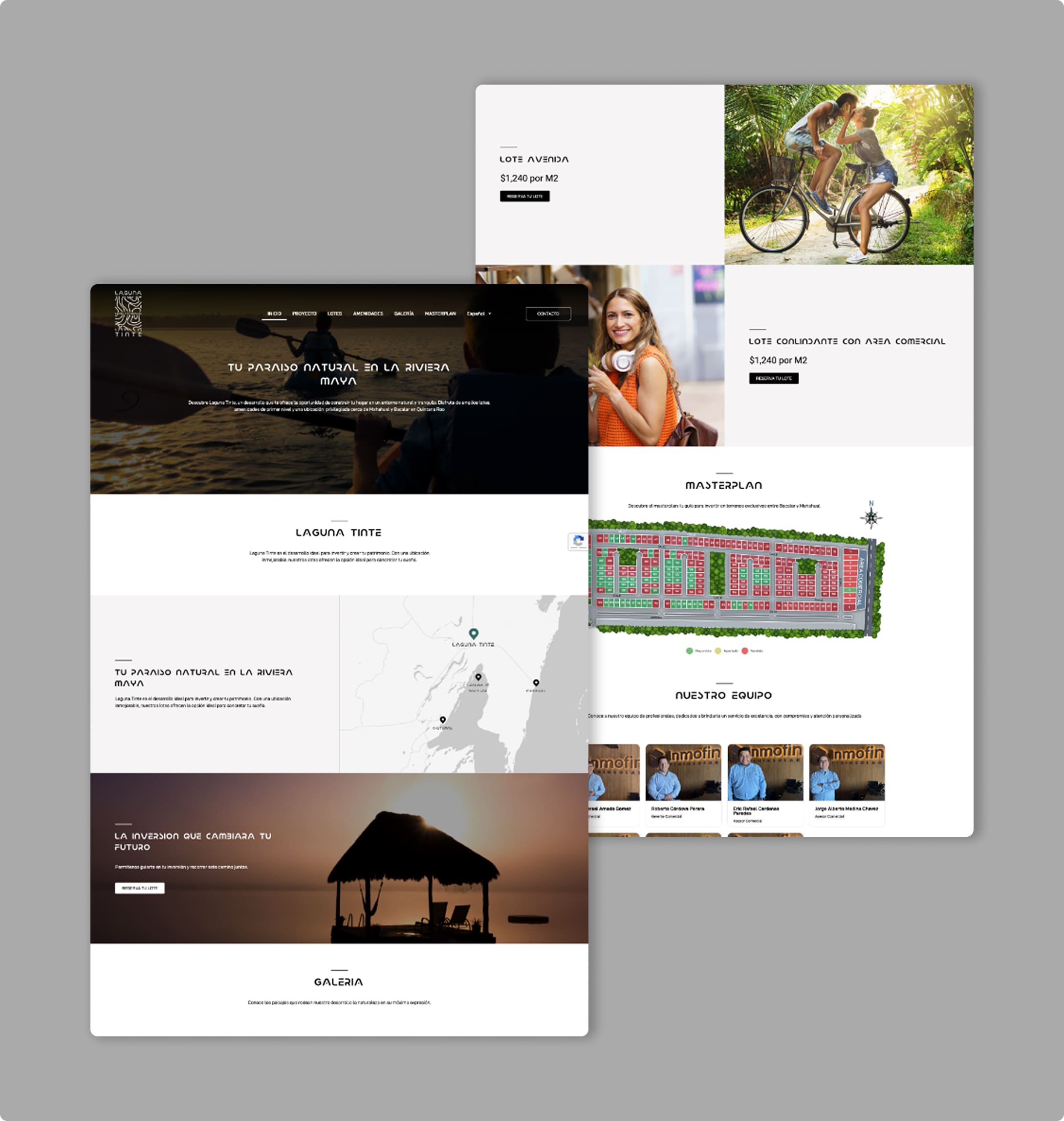Tuvimos la oportunidad de desarrollar el sitio web de Laguna Tinte, un proyecto inmobiliario que destaca por su propuesta única de vivir en equilibrio con la naturaleza. Diseñamos una plataforma digital atractiva y funcional que resalta la belleza del entorno, las amenidades del desarrollo y su visión de comunidad. El sitio es completamente responsivo y está optimizado para brindar una experiencia fluida desde cualquier dispositivo. El resultado es una herramienta efectiva que comunica el valor del proyecto y fortalece su presencia en el mercado.